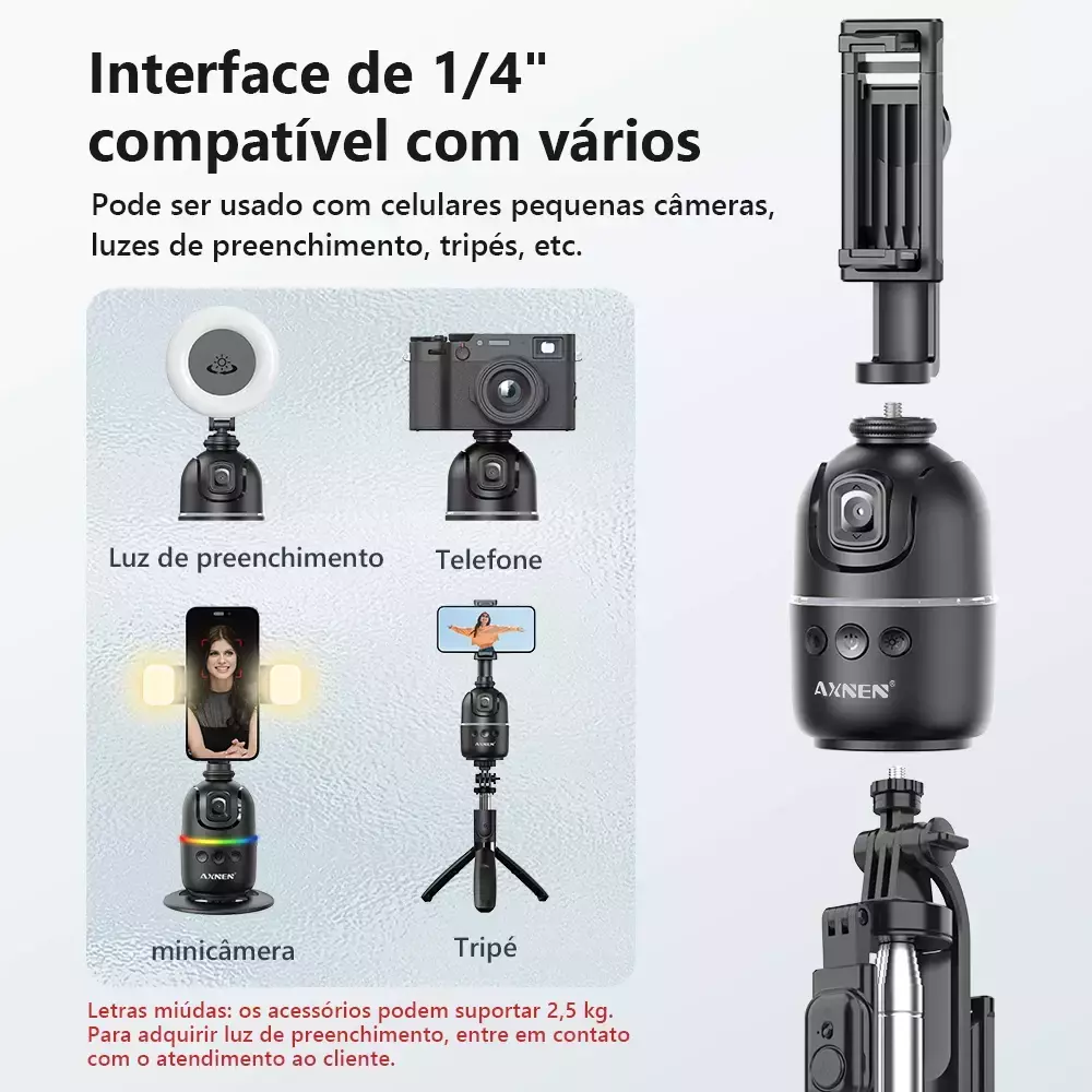 Transforme suas gravações, chamadas e lives com o AXNEN P03, o suporte inteligente que acompanha seus movimentos com rastreamento facial por inteligência artificial. Compacto, leve e versátil, ele é ideal para smartphones, câmeras de ação e mini câmeras, garantindo vídeos mais dinâmicos e profissionais sem esforço.